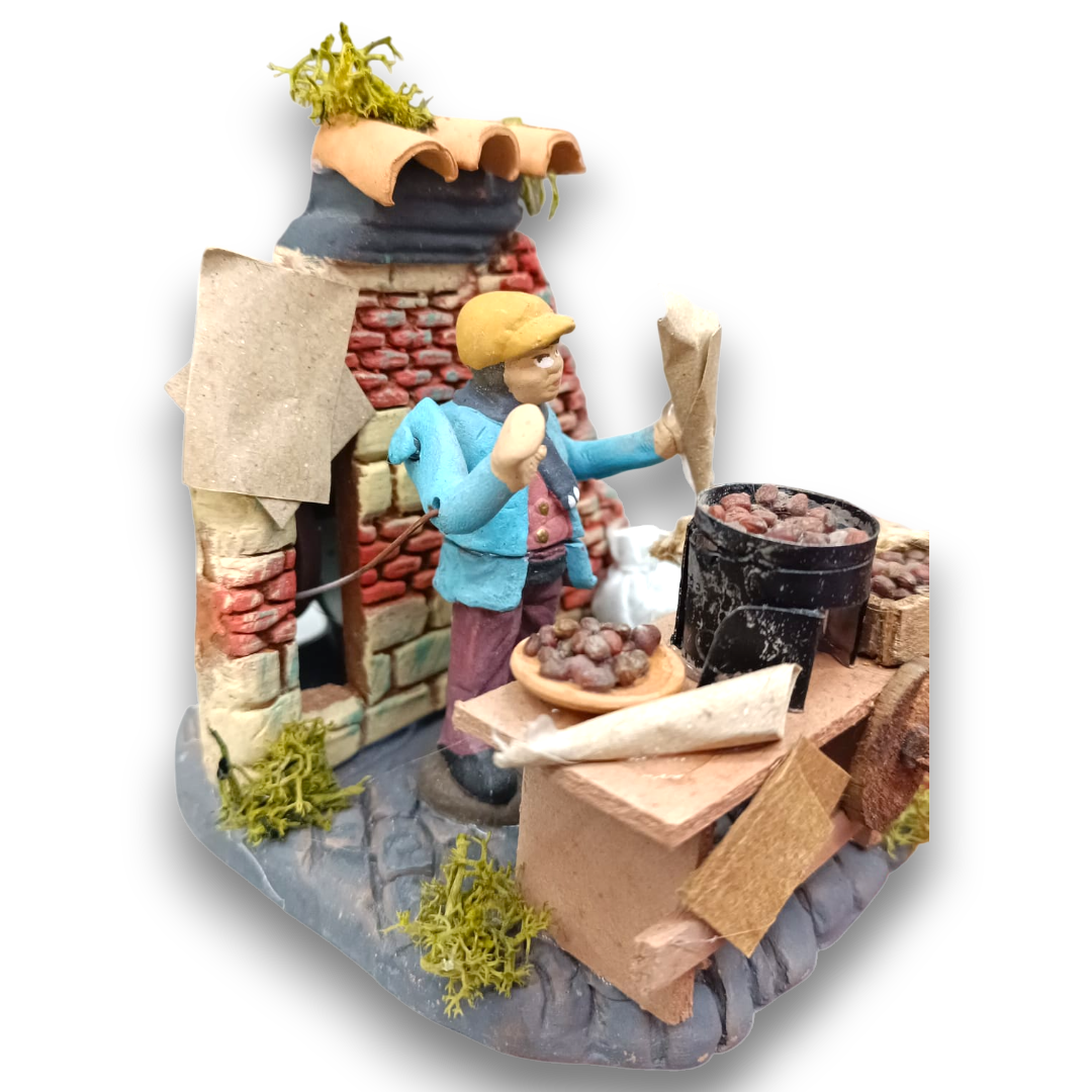 Il Castagnaro in terracotta 7 cm è una scena in movimento che arricchisce il presepe con un forte senso di realismo e tradizione. Realizzato interamente a mano dai maestri della terracotta napoletana, il Castagnaro in terracotta 7 cm rappresenta una tipica scena di strada, completa di accessori curati nei minimi dettagli.