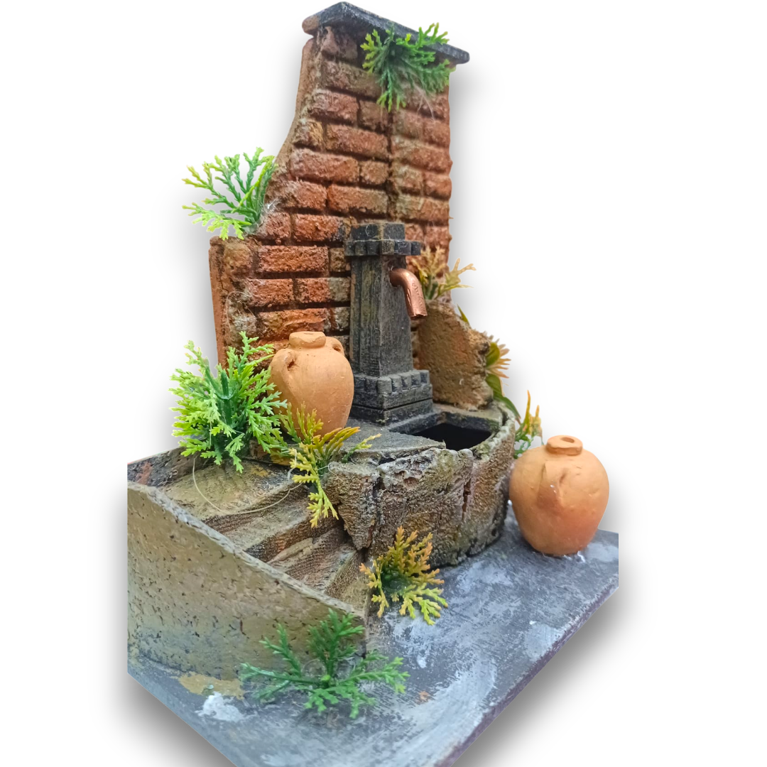 Grazie alla pompa ad alimentazione 220v, la Fontana Nasone con parete in mattoncini rossi offre un effetto acqua in movimento che dona vitalità all’ambientazione. La parete in sughero rosso rende la Fontana Nasone con parete in mattoncini rossi perfetta come sfondo scenografico per borghi e piazze del presepe.