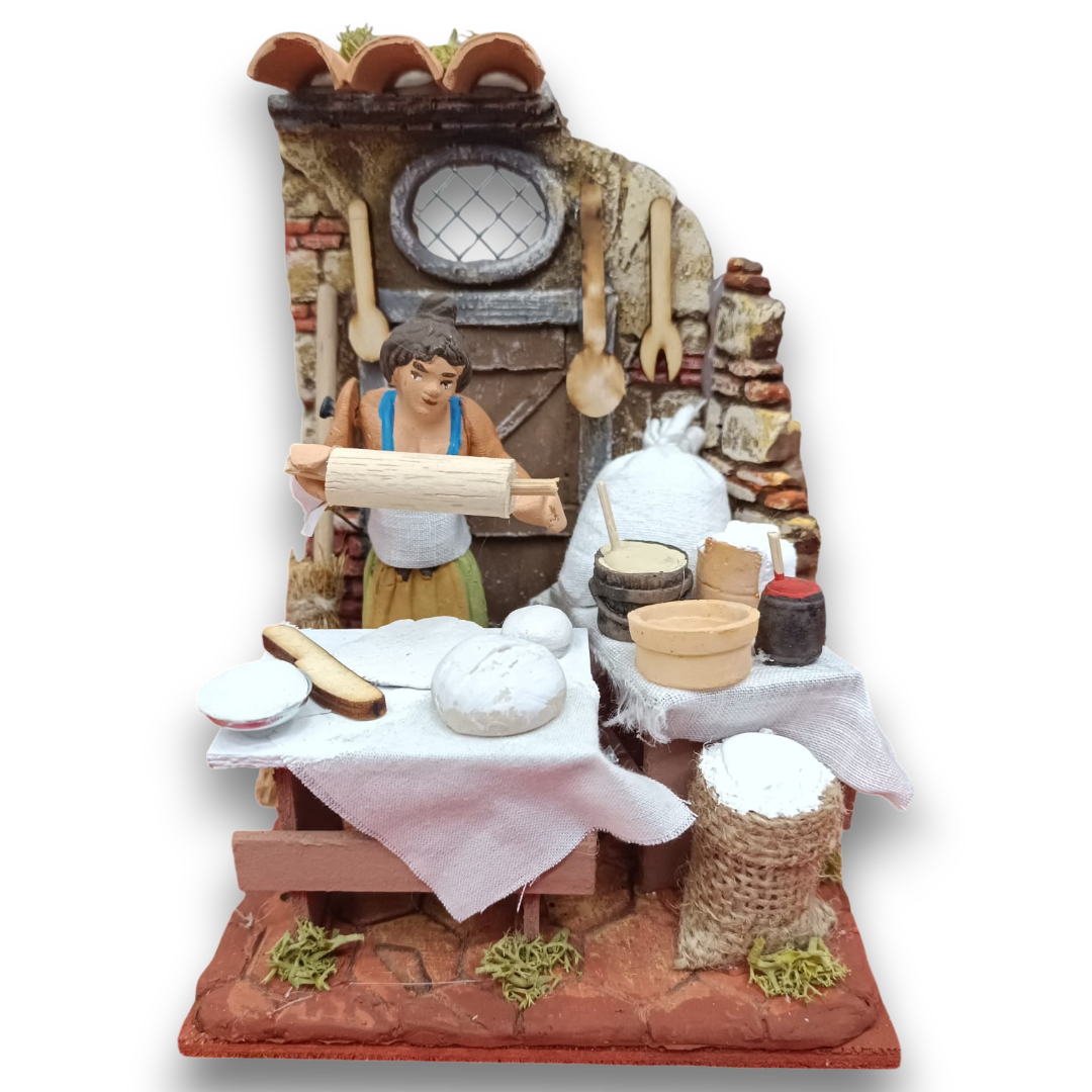 La Impastatrice in terracotta 10 cm è un gruppo in movimento che riproduce una delle scene più autentiche della tradizione artigianale napoletana. Realizzata interamente in terracotta, la Impastatrice in terracotta 10 cm rappresenta fedelmente la fase di impasto per pane, pasta o pizza, con grande attenzione ai dettagli.